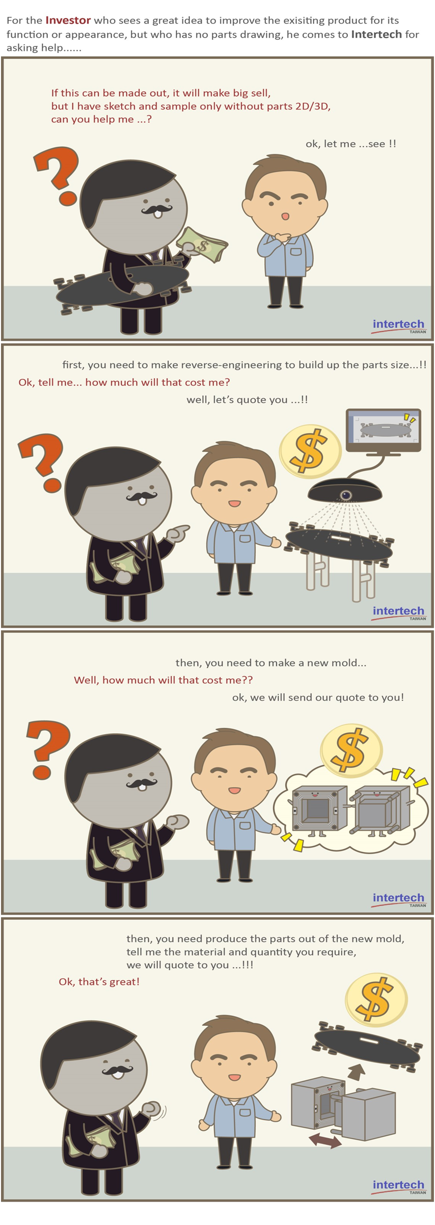 These cartoons are quite easy and fast to be understood.  Our four major customers: industrial designer, investor, plant manager and inventor, can easily find the best way to get in touch with Intertech by reading these cartoon to find the best supply solution from Intertech.
