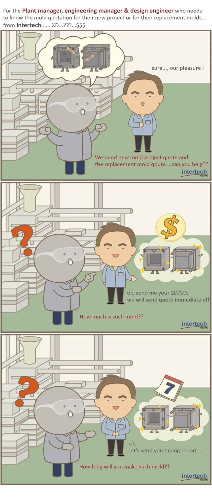 For providing better mold making and injection molding service to all our customers, Intertech makes this cartoon interaction presentation. Because we meet very often with many customers who has different project but do not know how to find the right supplier or the right solution for their project from their supplier due to their interaction is quite poor and takes too long time. This cartoon aims to help them to find the right interaction approach with their supplier (Intertech).