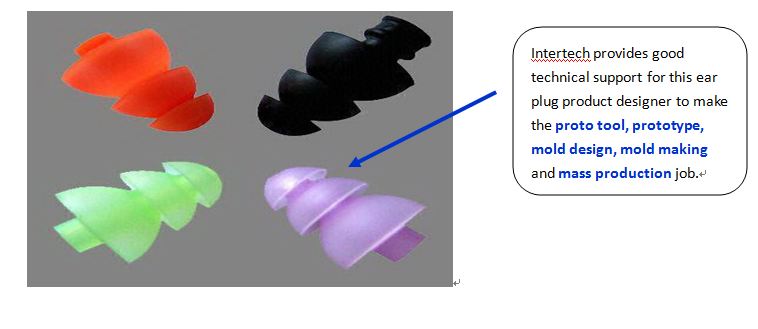 Intertech hace buenaoído tapones de silicona prototipo de herramienta,prototipo muestra de tapones para los oídos,molde de producción en serie & tapones para los oídos de productospor su gran cliente en Europa desde 2003 hasta ahora.
