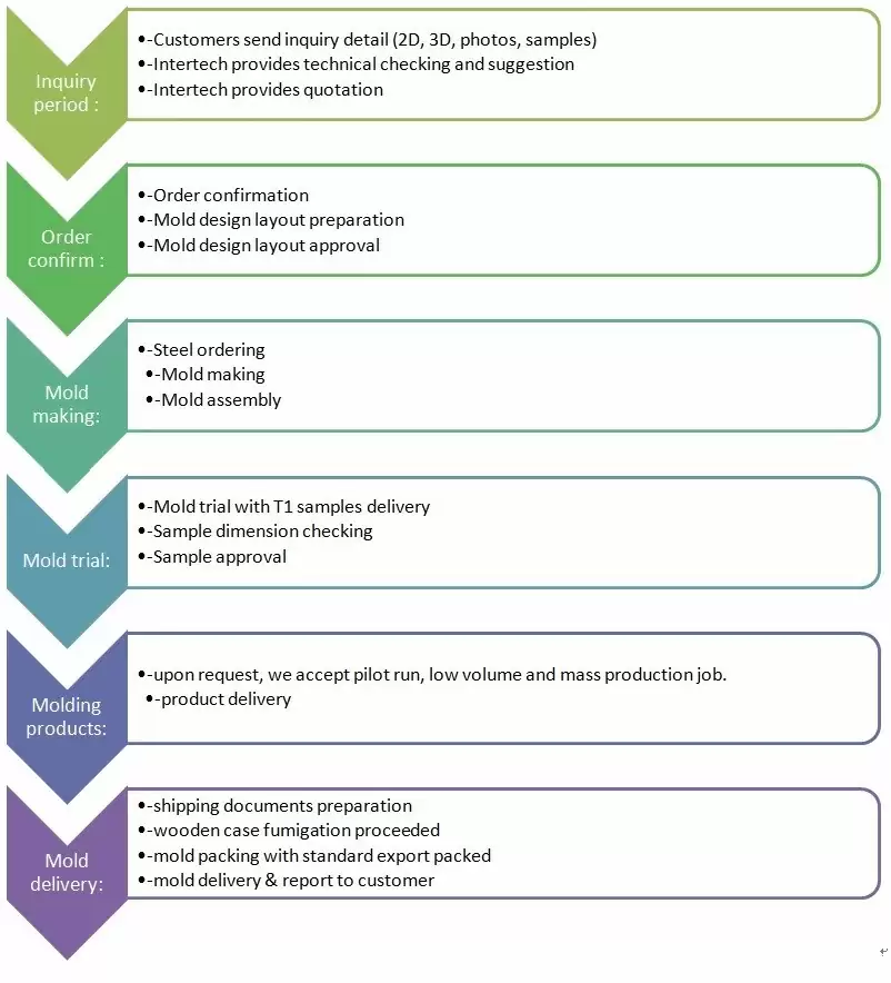 - Excepto haciendo el molde, también proporcionamos servicio de moldeo por inyección, servicio de moldeo por compresión (especial para material de caucho de silicona compuesto con varios colores que coinciden y trabajo de producción para la necesidad específica del producto) o servicio de producción de troquelado.